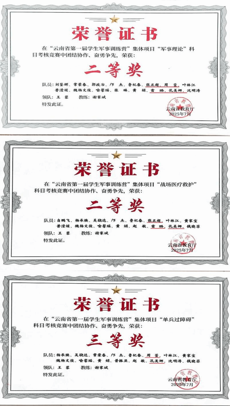 近日获悉,我校选派的雷璐、孔美娜、张正超、周萱四位同学,作为楚雄州代表队入选队员,凭借出色的综合素养,在云南省第一届学生军事训练营开展的激烈竞赛中脱颖而出,最终斩获军事理论二等奖、战场医疗救护二等奖、单兵过障碍三等奖三项殊荣。