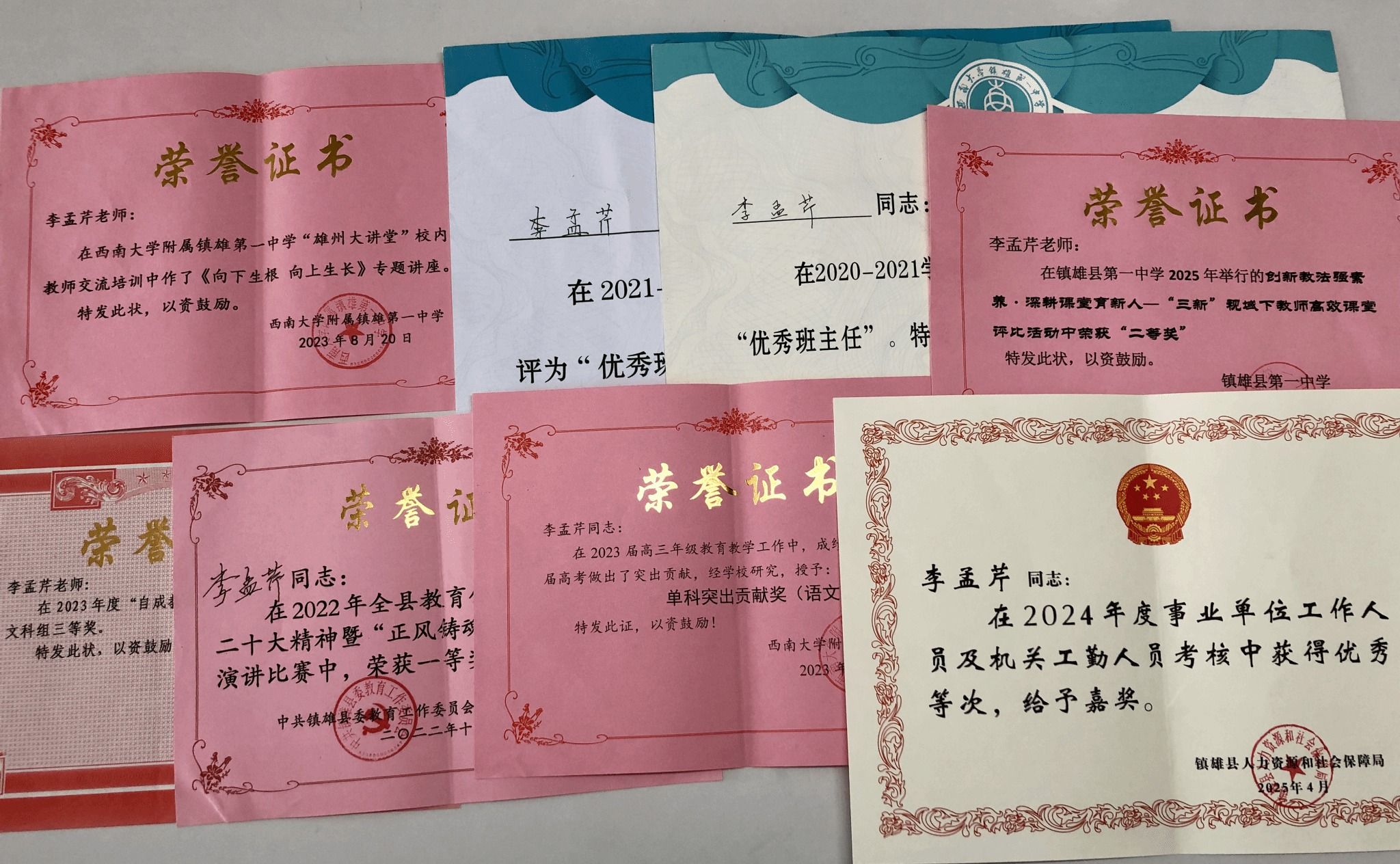7. 2025年4月,荣获镇雄县在2024年度事业单位工作人员及机关工勤人员考核中优秀等次;