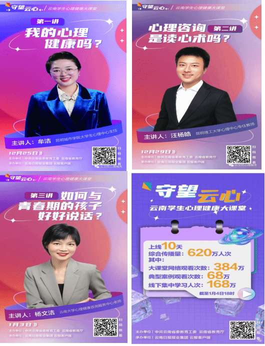 2023年12月25日起,中共云南省委教育工委、云南省教育厅联合云南日报报业集团云报客户端推出了“守望云心”云南学生心理健康大课堂、云南省学生心理健康典型工作案例短视频,面向全省1000余万在校学生及其教师、家长开展心理健康教育,呵护心灵,护航成长。